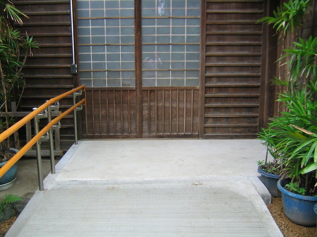バリアフリーリフォーム:手すり付きスロープ造りと玄関の段差解消:豊橋市