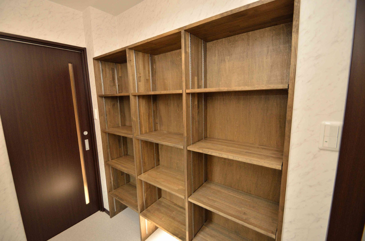 各収納に何を収納するかを決め、それをもとに配置した小屋裏収納や可動収納棚を設置しました。