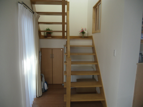 建物の真ん中に通し柱があり、LDKを広くするしつつ、採光を取る事に苦労してプランしました。思い切って階段を南へもっていき、オープン階段、オープン手摺りにする事で、キッチンにも採光を取り入れる事ができました。またLDKに収納や棚をたくさん配置することができました。